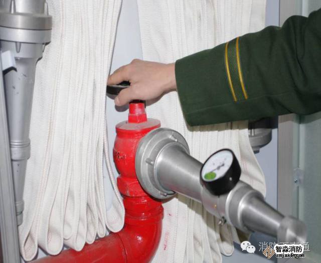 (c)打开消火栓阀门放水此时不应压折水带,压力表显示的水压即为消火栓栓口的水压力。